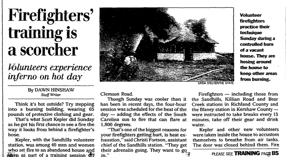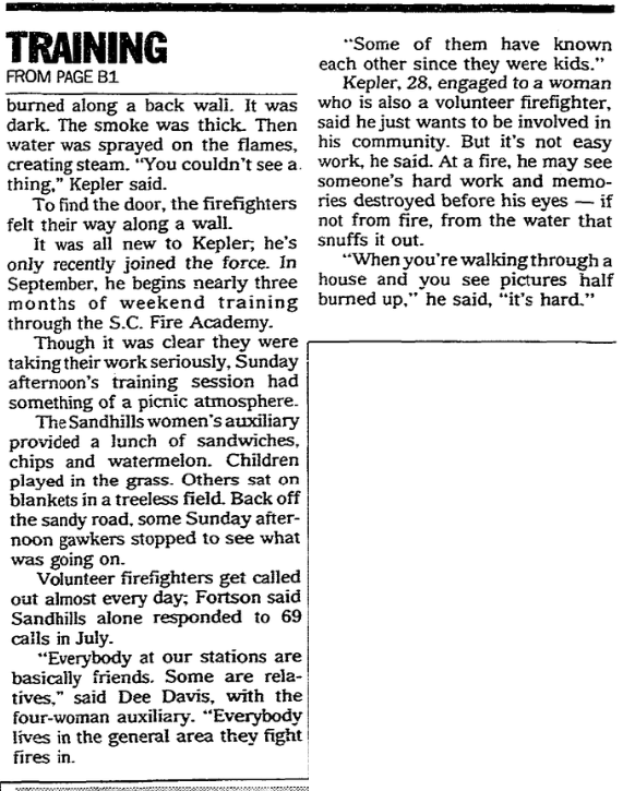Kepler, with the Sandhills volunteer station, was among 40 men and women who set fire to an abandoned house and barn as part of a training session off Clemson Road.