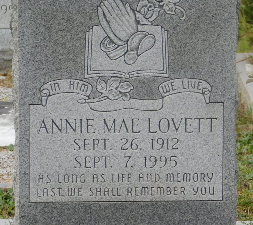 1912 Annie Mae Boone Lovett was born September 26, 1912 in Elgin, Kershaw, South Carolina, a daughter of Henry A. Boone and Katie Sharpe Boone. 1920 Census Information: According to the United States Census reported on January 14, 1920, Henry Boone (23) rented a home in Buffalo, Kershaw County, South Carolina with his wife Kate Boone (25) and children; Annie Mae Boone (7) and Gussie … Continue reading Annie Mae Boone Lovett