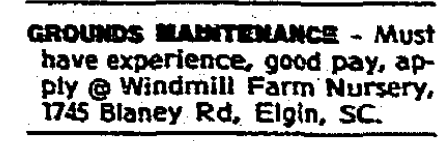 GROUNDS MAINTENANCE – Must have experience, good pay, apply @ Windmill Farm Nursery, 1745 Blaney Rd, Elgin, SC. Continue reading Trades / Skilled