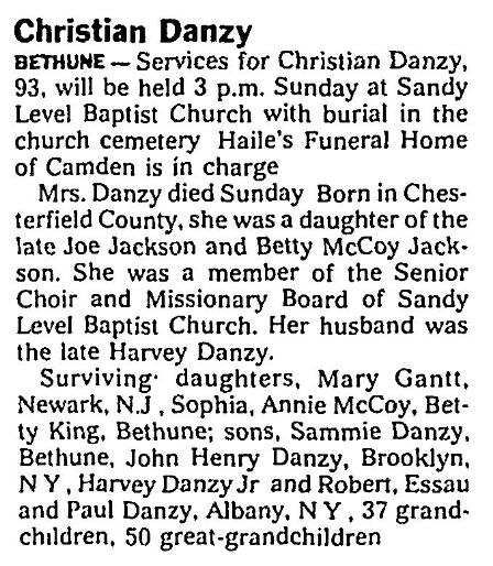 Mrs. Danzy died Sunday. Born in Chesterfield County, She was a daughter of the late Joe Jackson and Betty McCoy Jackson. She was a member of the Senior Choir and Missionary Board of Sandy Level Baptist Church. Her husband was the late Harvey Danzy.