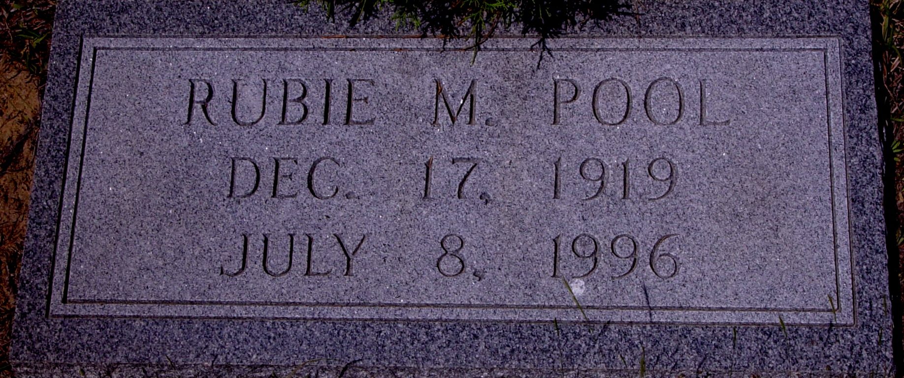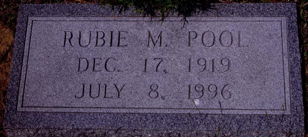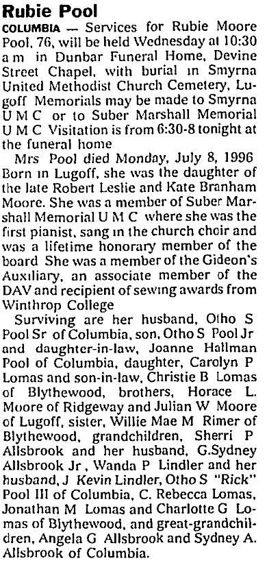 Mrs. Pool died Monday, July 8, 1996. Born in Lugoff, she was the daughter of the late Robert Leslie Moore and Kate Branham Moore. She was a member of Suber Marshall Memorial UMC where she was the first pianist, sang in the church choir and was a lifetime honorary member of the board. She was a member of the Gideon’s Auxiliary, an associate member of the DAV and Recipient of sewing awards from Winthrop College.