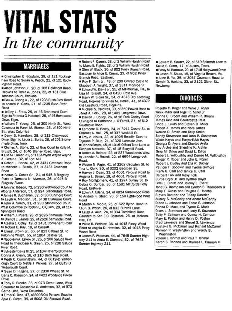 Napoleon A. Eskew Sr., 25, of 200 Saluda River Road to Theodosia A. Green, 25, of 200 Saluda River Road.
