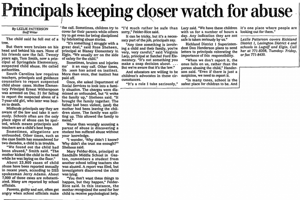 Midlands principals say they are aware of the law and take it seriously. Schools often are the only place signs of abuse can be spotted, which means principals and teachers are a child’s best hope.