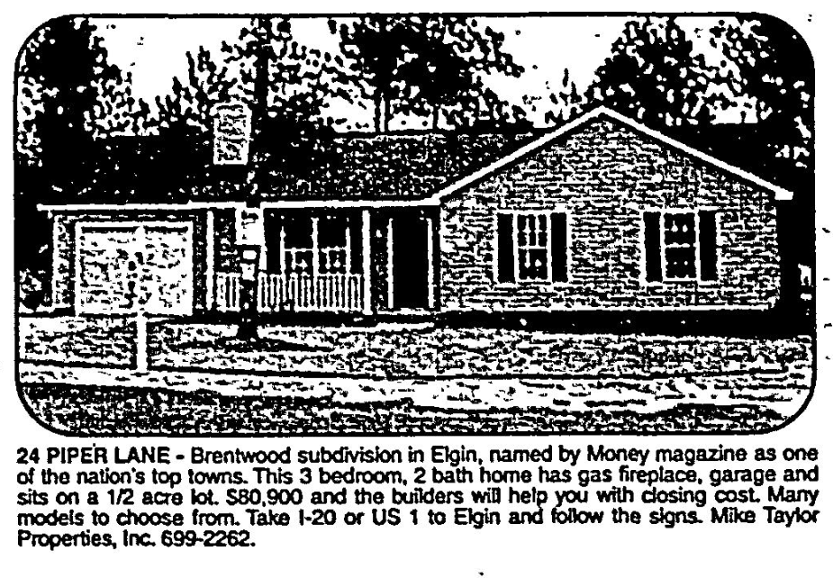 24 PIPER LANE – Brentwood subdivision in Elgin, named by Money magazine as one of the nation’s top towns. This 3 bedroom, 2 bath home has gas fireplace, garage and sits on a 1/2 acre lot. $80,900 and the builders will help you with closing cost. Many models to choose from. Take 1-20 or US 1 to Elgin and follow the signs. Mike Taylor Properties, Inc. 699-2262.