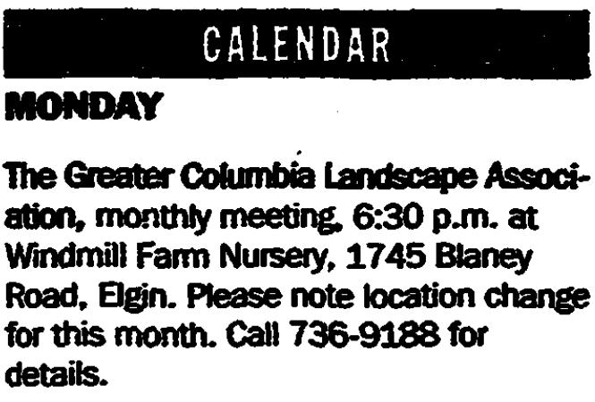 The Great Columbia Landscape Association, monthly meeting, 6:30 p.m. at Windmill Farm Nursery, 1745 Blaney Road, Elgin. Please note Location change for this month. Call 736-9188 for details.