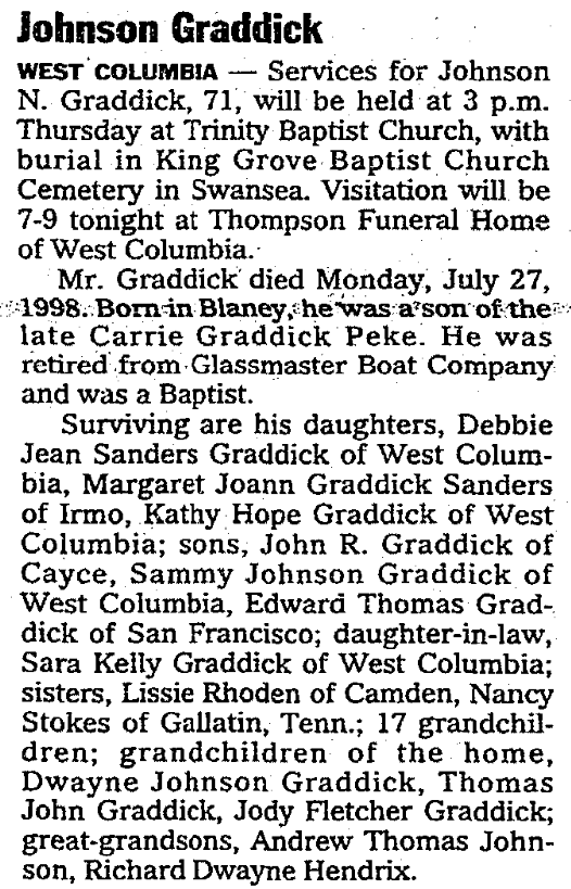 Surviving are his daughters, Debbie Jean Sanders Graddick of West Columbia, Margaret Joann Graddick Sanders of Irmo, Kathy Hope Graddick of West Columbia; sons, John R. Graddick of Cayce, Sammy Johnson Graddick of West Columbia, Edward Thomas Graddick of San Francisco; daughter-in-law, Sara Kelly Graddick of West Columbia; sisters, Lissie Rhoden of Camden, Nancy Stokes of Gallatin, Tenn; 17 grandchildren; grandchildren of the home, Dwayne Johnson Graddick, Thomas John Graddick, Jody Fletcher Graddick; great-grandsons, Andrew Thomas Johnson, Richard Dwayne Hendrix.