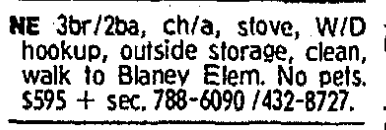 NE 3br / 2 ba, ch/a, stove, W/D hookup, outside storage, clean, walk to Blaney Elem. No pets. $595 + Sec. 788-6090 / 432-8727