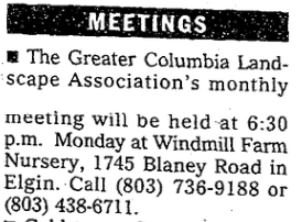 The Greater Columbia Landscape Association monthly meeting will be held at 6:30 p.m. September 14 at Windmill Farm Nursery, 1745 Blaney Road in Elgin. Call (803) 736-9188