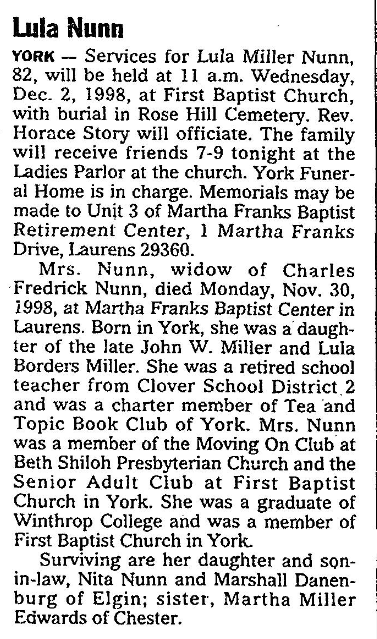 Mrs. Nunn, widow of Charles Fredrick Nunn, died Monday, Nov. 30, 1998, at Martha Franks Baptist Center in Laurens. Born in York, she was a daughter of the late John W. Miller and Lula Borders Miller. She was a retired school teacher from Clover School District 2 and was a charter member of Tea and Topic Boook Club of York. Mrs. Nunn was a member of the Moving on Club at Beth Shiloh Presbyterian Church and the Senior Adult Club at First Baptist Church in York. She was a graduate of Winthrop College and was a member of First Baptist Church in York.