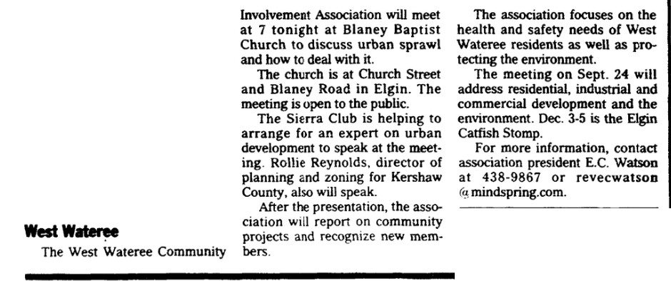 The Sierra Club is helping to arrange for an expert on urban development to speak at the meeting. Rollie Reynolds, director of planning and zoning for Kershaw County, also will speak.