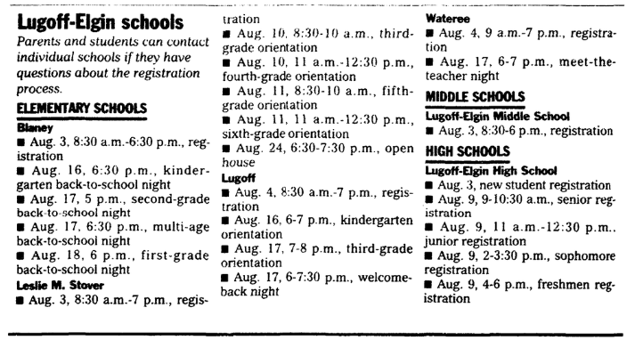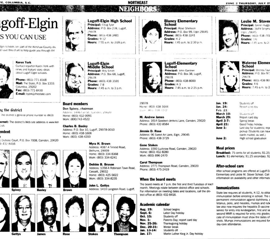 Parents and Students can contact individual schools if they have questions about the registration process. ELEMENTARY SCHOOLS BlaneyAug. 3, 8:30 a.m. – 6:30 p.m., registrationAug.16, 6:30 p.m., kindergarten back to school nightAug. 17, 5 p.m., second-grade back to school nightAug. 17, 6:30 p.m., multi-age back to school nightAug. 18, 6 p.m., first-grade back to school night Leslie M. StoverAug. 3, 8:30 a.m. – 7 p.m., … Continue reading Lugoff-Elgin schools
