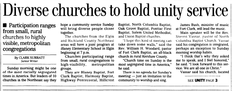 Main speaker will be the Rev. Steven Vassar, pastor of North Columbia Baptist Church. Vassar said his congregation is integrated, perhaps an exception to Sunday morning worship habits.