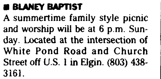 A summertime family style picnic and worship service will be at 6 p.m. Sunday. Located at the intersection of White Pond Road and Church Street off U. S. 1. in Elgin (803) 438-3161.
