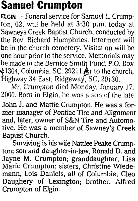 ELGIN – Funeral service for Samuel L. Crumpton, 62, will be held at 3:30 p.m. today at Sawneys Creek Baptist Church, conducted by the Rev. Richard Humphries. Interment will be in the church cemetery. Visitation will be one hour prior to the service. Memorials may be made to the Bernice Smith Fund, P.O. Box 11304, Columbia, SC, 29211, or to the church, Highway 34 East, Ridgeway, SC, 29130.