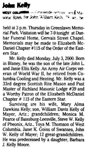 Mr. Kelly died Monday, July 3, 2000. Born in Blaney, he was the son of the late John L. and Janie Ellis Kelly. An Army Air Corps veteran of World War II, he retired from Columbia Cooling and Heating. Mr. Kelly was a 33rd degree Scottish Rite Mason and Past Master of Richland Masonic Lodge #39 and a Worthy Patron of the Elizabeth McDaniel Chapter # 115 of the Eastern Star.