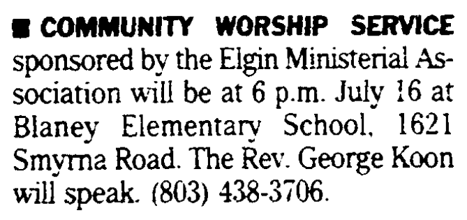 COMMUNITY WORSHIP SERVICE sponsored by the Elgin Ministerial Association will be at 6 p.m. July 16 at Blaney Elementary School. 1621 Smyrna Road. The Rev. George Koon will Speak. (803) 438-3706.