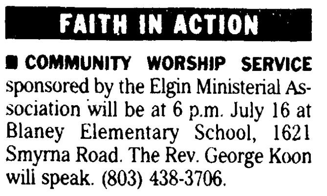 COMMUNITY WORSHIP SERVICE sponsored by the Elgin Ministerial Association will be at 6 p.m. July 16 at Blaney Elementary School. 1621 Smyrna Road. The Rev. George Koon will Speak. (803) 438-3706.