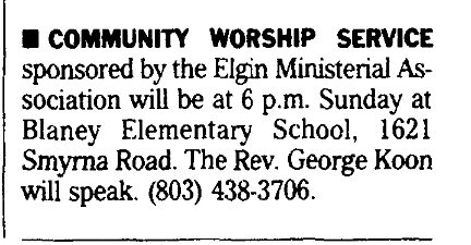 COMMUNITY WORSHIP SERVICE sponsored by the Elgin Ministerial Association will be at 6 p.m. July 16 at Blaney Elementary School. 1621 Smyrna Road. The Rev. George Koon will Speak. (803) 438-3706.