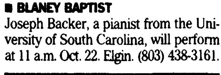 Joseph Backer, a pianist from the University of South Carolina, will perform at 11 a.m. Oct 22, Elgin. (803) 438-3161.
