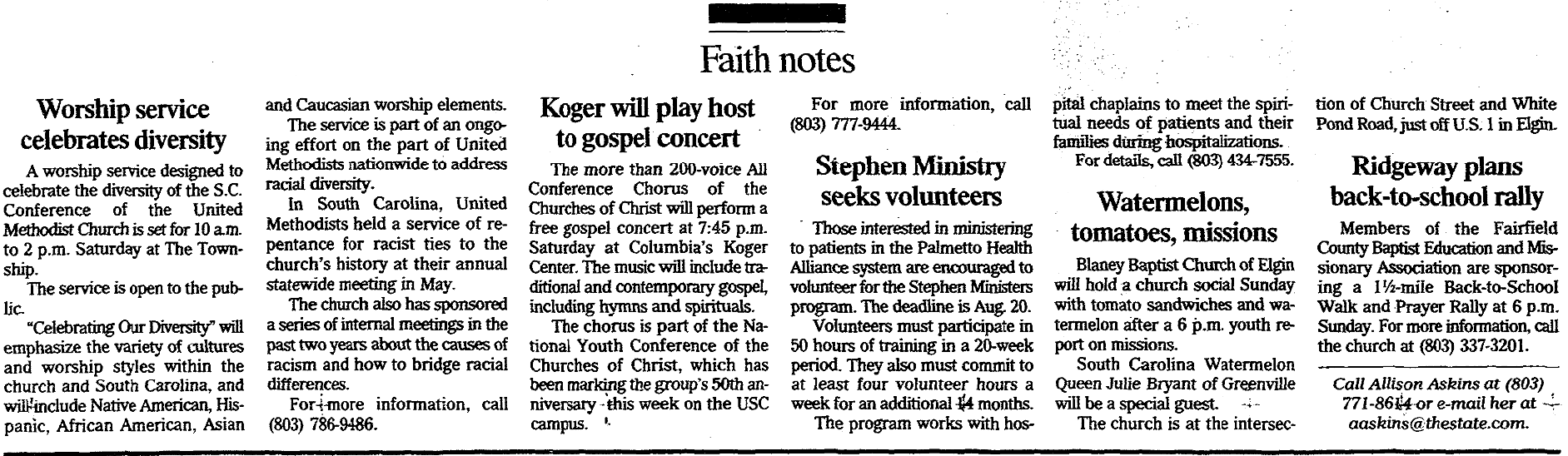 Faith Notes is compiled by Allison Askins. She can be reached by phone at (803) 771-8614 or by e-mail at aaskins@thestate.com.