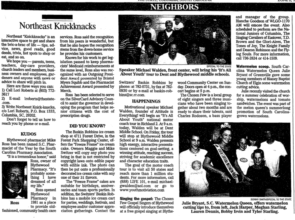 Watermelon scoop. South Carolina Watermelon Queen Julie Bryant of Greenville gave some young members of Blaney Baptist Church of Elgin some watermelon cutting advice. Julie recently visited the church for a summer celebration of worship, watermelons and tomato sandwiches. The event was part of the melon queen’s summerlong promotion of South Carolina-grown watermelons.Caption: 1. Ross2. Speaker Michael Walden, front center, will bring his “It’s All About Youth” tour to Dent and Blythewood middle schools. SPECIAL TO THE STATE3. Julie Bryant, S.C. Watermelon Queen, offers watermelon cutting tips to, from left, Jack Harper, Meghan Starling, Lauren Dennis, Bobby Irvin and Tyler Starling. SONNY SMITH/SPECIAL TO THE STATE