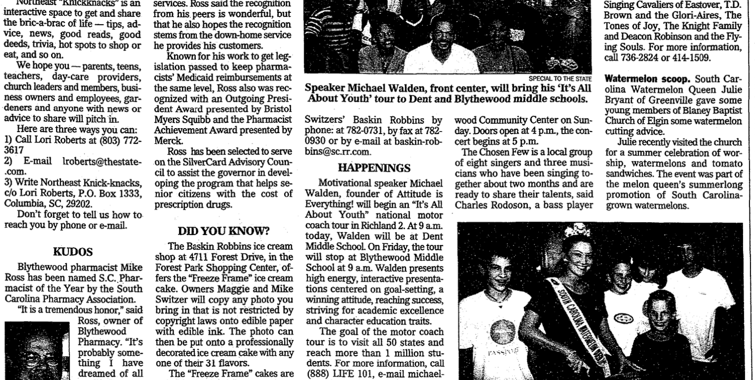 Watermelon scoop. South Carolina Watermelon Queen Julie Bryant of Greenville gave some young members of Blaney Baptist Church of Elgin some watermelon cutting advice. Julie recently visited the church for a summer celebration of worship, watermelons and tomato sandwiches. The event was part of the melon queen’s summerlong promotion of South Carolina-grown watermelons.Caption: 1. Ross2. Speaker Michael Walden, front center, will bring his “It’s All About Youth” tour to Dent and Blythewood middle schools. SPECIAL TO THE STATE3. Julie Bryant, S.C. Watermelon Queen, offers watermelon cutting tips to, from left, Jack Harper, Meghan Starling, Lauren Dennis, Bobby Irvin and Tyler Starling. SONNY SMITH/SPECIAL TO THE STATE