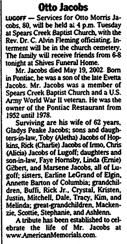 Mr. Jacobs died May 19, 2002. Born in Pontiac, he was a son of the late Evetta Jacobs. Mr. Jacobs was a member of Spears Creek Baptist Church and a U.S. Army World War II veteran. He was the owner of the Pontiac Restaurant from 1952 until 1978.
