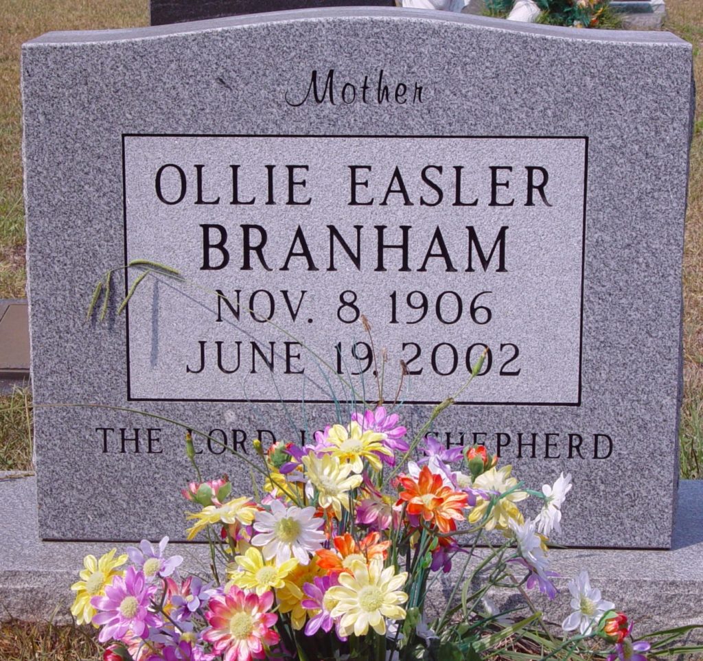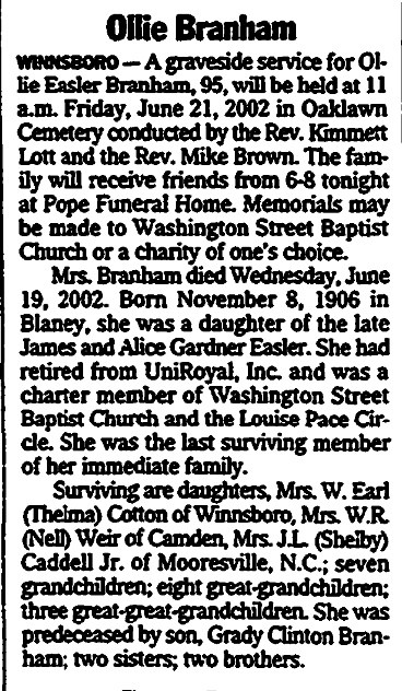 WINNSBORO – A graveside service for Ollie Easler Branham, 95, will be held at 11 a.m. Friday, June 21, 2002 in Oaklawn Cemetery conducted by the Rev. Kimmett Lott and the Rev. Mike Brown. The family will receive friends from 6-8 tonight at Pope Funeral Home. Memorials may be made to Washington Street Baptist Church or a charity of one’s choice.