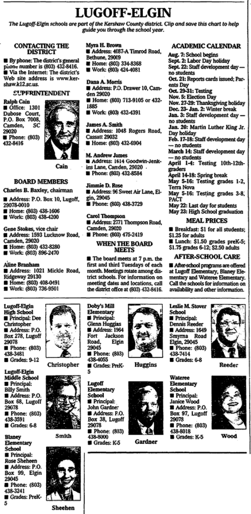 The Lugoff-Elgin schools are part of the Kershaw County district. Clip and save this chart to help guide you through the school year.