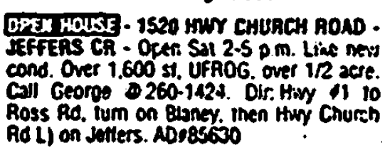OPEN HOUSE – 1520 HWY CHURCH ROAD – JEFFERS CR – Open Sat 2-5 p.m. Like new cond. Over 1,600 sf, UFROG, over 1/2 acre. Call George @ 260-1424. Dir Hwy #1 to Ross Rd, turn on Blaney, then Hwy Church Rd L) on Jeffers. AD#85630