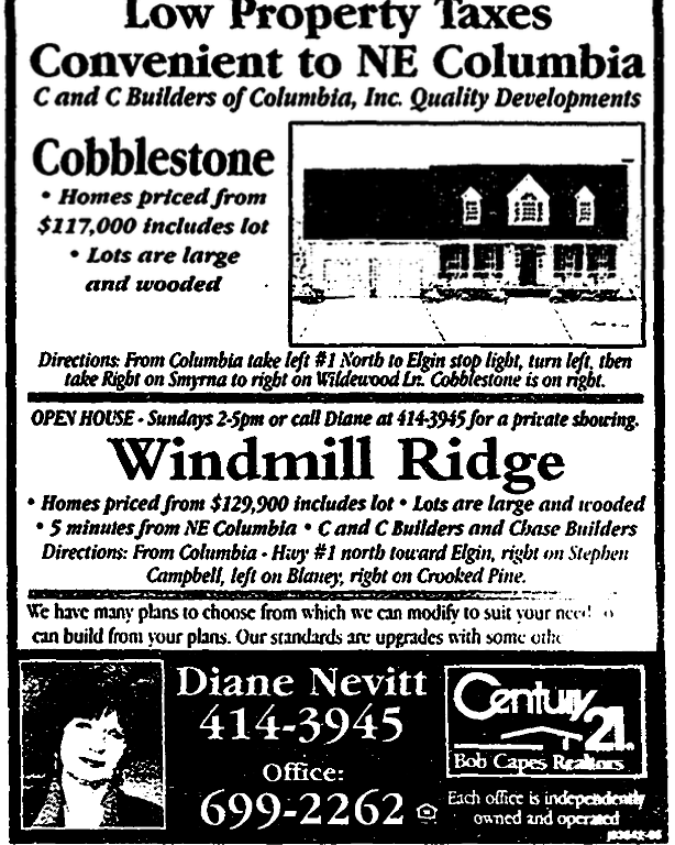 Directions: From Columbia – Hwy #1 north toward Elgin, right on Stephen Campbell, left on Blaney, right on Crooked Pine.