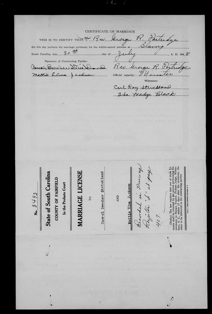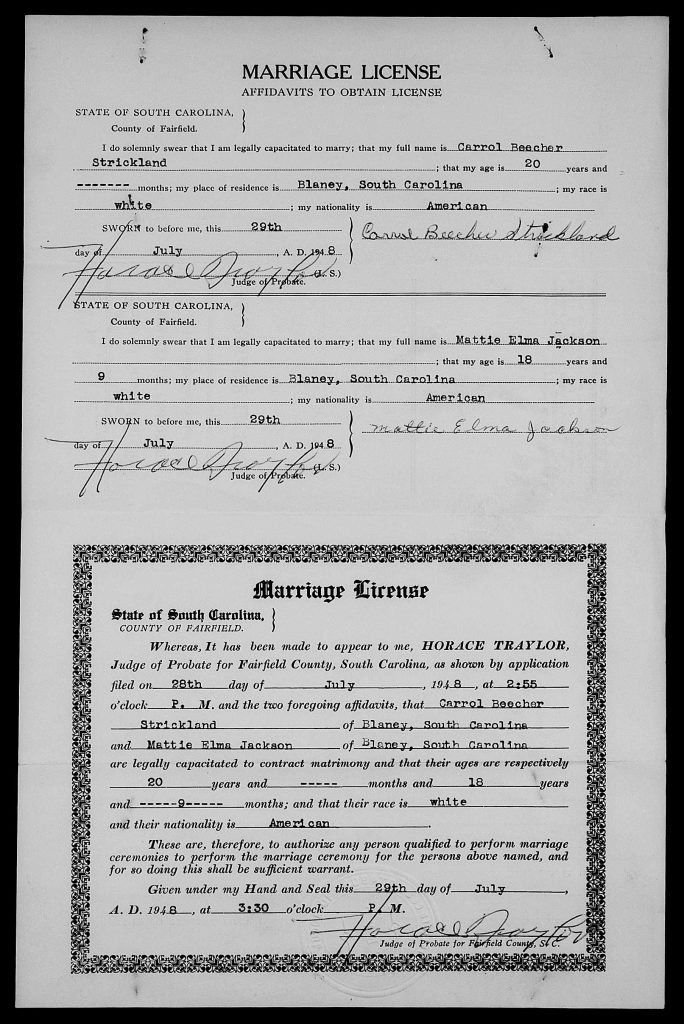 When she was 17, she married Carrol Beecher Strickland on 29 Jul 1948 in Fairfield, South Carolina, USA.