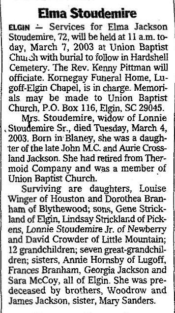 ELGIN – Services for Elma Jackson Stoudemire, 72, will be held at 11 a.m. today, March 7, 2003 at Union Baptist Church with burial to follow in Hardshell Cemetery. The Rev. Kenny Pittman will officiate. Kornegay Funeral Home, Lugoff-Elgin Chapel, is in charge. Memorials may be made to Union Baptist Church, P.O. Box 116, Elgin, SC 29045.