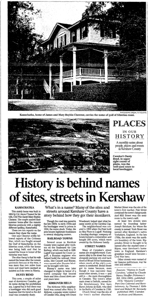 HISTORY IS BEHIND NAMES OF SITES, STREETS IN KERSHAW