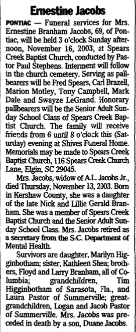 PONTIAC – Funeral services for Mrs. Ernestine Harriet Branham Jacobs, 69, of Pontiac, will be held 3 o’clock Sunday afternoon, November 16, 2003, at Spears Creek Baptist Church, conducted by Pastor Paul Stephens. Interment will follow in the church cemetery. Serving as pallbearers will be Fred Spears, Carl Brazell, Marion Motley, Tony Campbell, Mark Dale and Swayze LeGrand. Honorary pallbearers will be the Senior Adult Sunday School Class of Spears Creek Baptist Church. The family will receive friends from 6 until 8 o’clock this (Saturday) evening at Shives Funeral Home. Memorials may be made to Spears Creek Baptist Church, 116 Spears Creek Church Lane, Elgin, SC 29045.