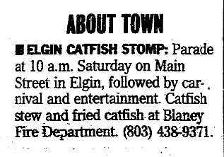ELGIN CATFISH STOMP: Parade at 10 a.m. Saturday on Main Street in Elgin, followed by carnival and entertainment. Catfish stew and fried catfish at Blaney Fire Department (803) 438-9371