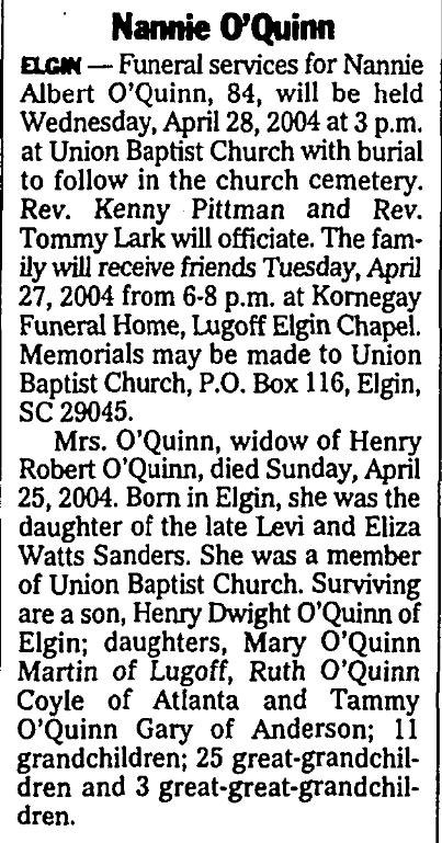 Mrs. O’Quinn, widow of Henry Robert O’Quinn, died Sunday, April 25, 2004. Born in Elgin, she was the daughter of the late Levi Sanders and Eliza Watts Sanders. She was a member of Union Baptist Church. Surviving are a son, Henry Dwight O’Quinn of Elgin; daughters, Mary O’Quinn Martin of Lugoff, Ruth O’Quinn Coyle of Atlanta and Tammy O’Quinn Gary of Anderson; 11 grandchildren; 25 great-grandchildren and 3 great-great-grandchildren.