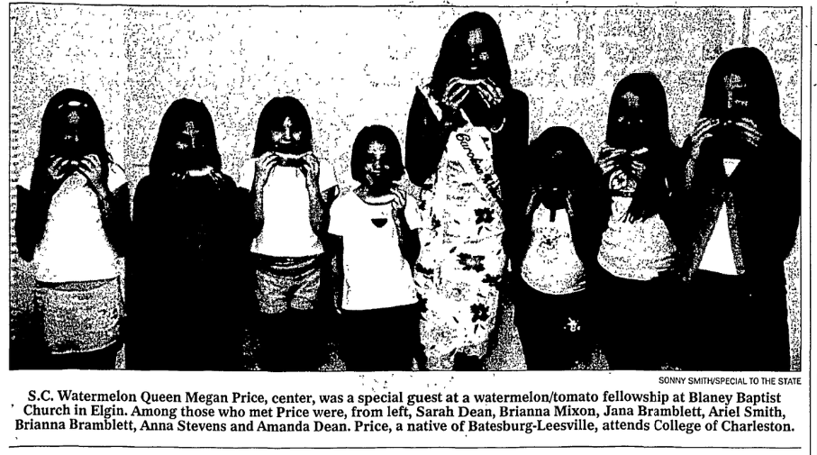S. C. Watermelon Queen Megan Price, center, was a special guest at a watermelon/tomato fellowship at Blaney Baptist Church in Elgin. Among those who met Price were, from left, Sarah Dean, Brianna Mixon, Jana Bramblett, Ariel Smith, Brianna Bramblett, Anna Stevens and Amanda Dean. Price, a native of Batesburg-Leesville, attends College of Charleston.