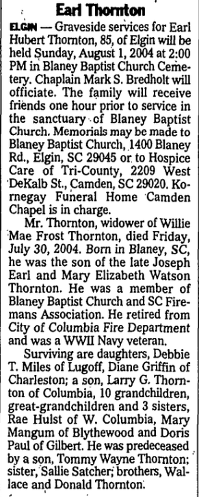 Mr. Thornton, widower of Willie Mae Frost Thornton, died Friday, July 30, 2004. Born in Blaney, SC, he was the son of the late Joseph Earl Thornton and Mary Elizabeth Watson Thornton. He was a member of Blaney Baptist Church and SC Fireman’s Association. He retired from City of Columbia Fire Department and was a WWII Navy veteran.