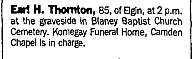 ELGIN – Graveside services for Earl Hubert Thornton, 85, of Elgin will be held Sunday, August 1, 2004 at 2:00 PM in Blaney Baptist Church Cemetery. Chaplain Mark S. Bredholt will officiate. The family will receive friends one hour prior to service in the sanctuary of Blaney Baptist Church. Memorials may be made to Blaney Baptist Church, 1400 Blaney Rd., Elgin, SC 29045 or to Hospice Care of Tri-County, 2209 West DeKalb St., Camden, SC 29020. Kornegay Funeral Home Camden Chapel is in charge.