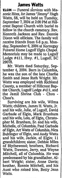 ELGIN – Funeral services with Masonic Rites, for James “Jimmy” Hugh Watts, 58, will be held on Tuesday, September 7, 2004 at 2:00 PM at Hillcrest Baptist Church with burial to follow in the church cemetery. Rev. Kenneth Jackson and Rev. Donnie Dixon will officiate. The family will receive friends from 6-8 p.m. Monday, September 6, 2004 at Kornegay Funeral Home Lugoff Elgin Chapel. Memorials may be made to Lugoff Lodge #411, Hwy. #1, Lugoff, SC 29078.