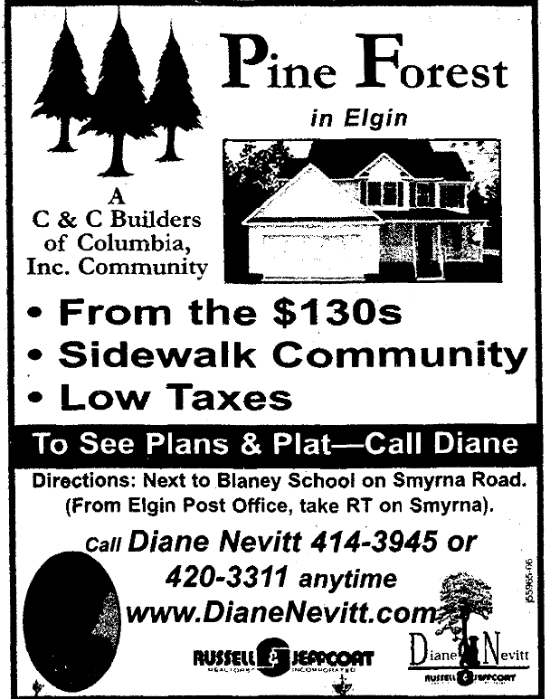 Pine Forest in Elgin A C & C Builders of Columbia, Inc. Community From the $130s Sidewalk Community Low Taxes To See Plans & Plat – Call Diane Directions: Next to Blaney School on Smyrna Road.(From Elgin Post Office, take RT on Smyrna). Call Diane Nevitt 414-3945 or420-3311 anytimewww.DianeNevitt.Com Russell & JeffcoatRealtors Incorporated Continue reading Pine Forest