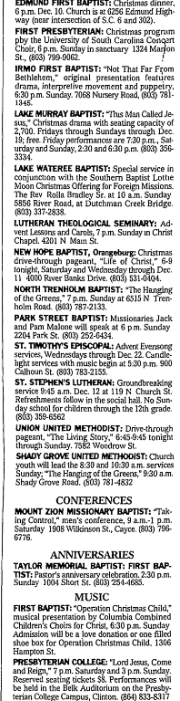 COLUMBIA CHRISTMAS PAGEANT: 7:30 p.m. Thursday, Dec. 10 and 11 with matinees at 4 p.m. Dec. 11 and 12. Performances at First Baptist Church of Columbia, 1306 Hampton St. Admission free, but tickets required, call (803) 343-8555.