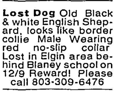 Lost Dog Old Black & white English Shepard, looks like border collie Male Wearing red no-slip collar Lost in Elgin area behind Blaney school on 12/9 Reward! Please call 803-309-6476