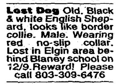Lost Dog Old Black & white English Shepard, looks like border collie Male Wearing red no-slip collar Lost in Elgin area behind Blaney school on 12/9 Reward! Please call 803-309-6476