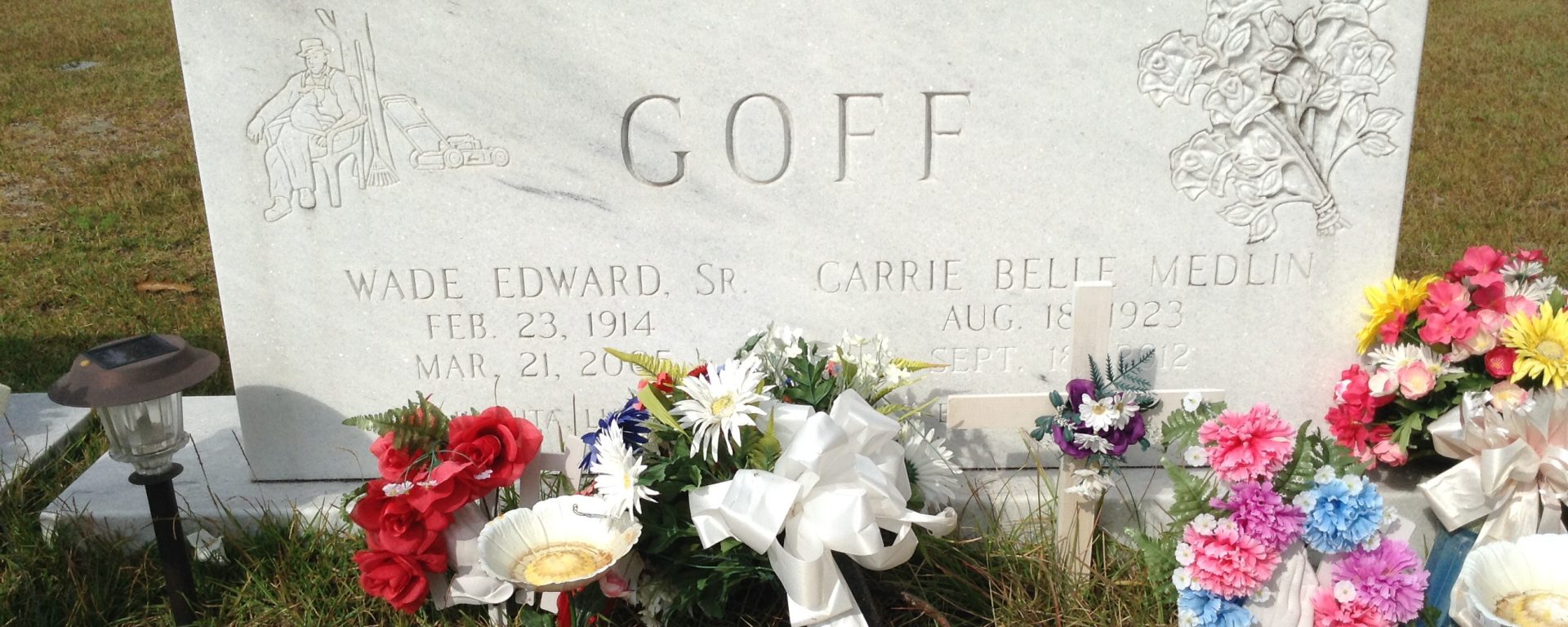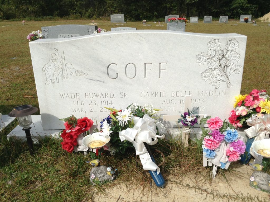 On 20 September 2012, Wade Edward Goff Sr was mentioned as the deceased husband in the obituary of Carrie Belle “Granny” Medlin Goff.