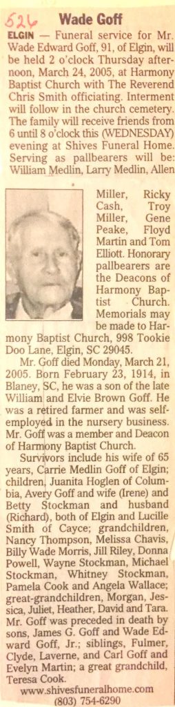 ELGIN — Funeral service for Mr. Wade Edward Goff, 91, of Elgin, will be held 2 o’clock Thursday afternoon, March 24, 2005, at Harmony Baptist Church with The Reverend Chris Smith officiating. Interment will follow in the church cemetery. The family will receive friends from 6 until 8 o’clock this (WEDNESDAY) evening at Shives Funeral Home. Serving as pallbearers will be: William Medlin, Larry Medlin, Allen Miller, Ricky Cash, Troy Miller, Gene Peake, Floyd Martin and Tom Elliott. Honorary pallbearers are the Deacons of Harmony Baptist Church. Memorials may be made to Harmony Baptist Church, 998 Tookie Doo Lane, Elgin, SC 29045.