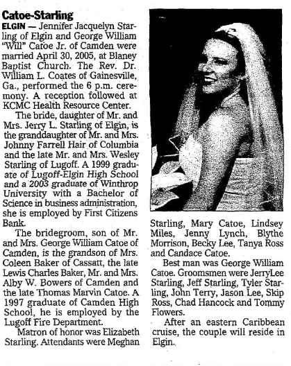 ELGIN – Jennifer Jacquelyn Starling of Elgin and George William “Will” Catoe Jr. of Camden were married April 30, 2005, at Blaney Baptist Church. The Rev. Dr. William L. Coates of Gainesville, Ga., performed the 6 p.m. ceremony. A reception followed at KCMC Health Resource Center.