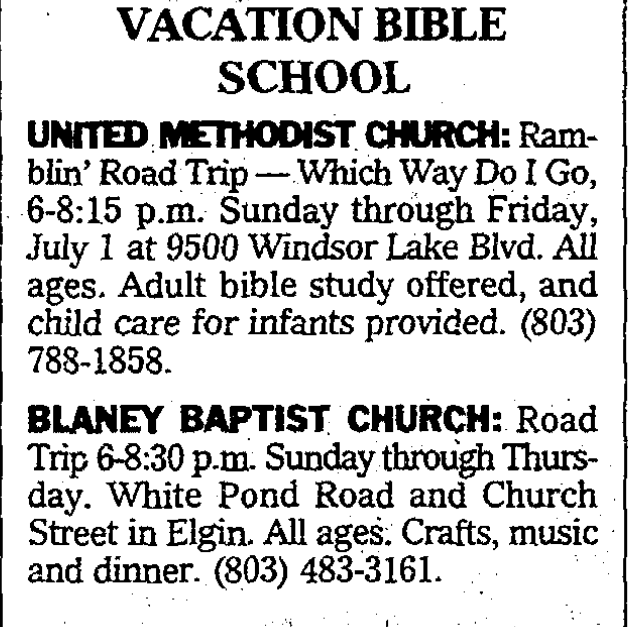 BLANEY BAPTIST CHURCH: Road Trip 6-8:30 p.m. Sunday through Thursday. White Pond Road and Church Street in Elgin. All ages. Crafts, music and dinner. (803) 483-3161.