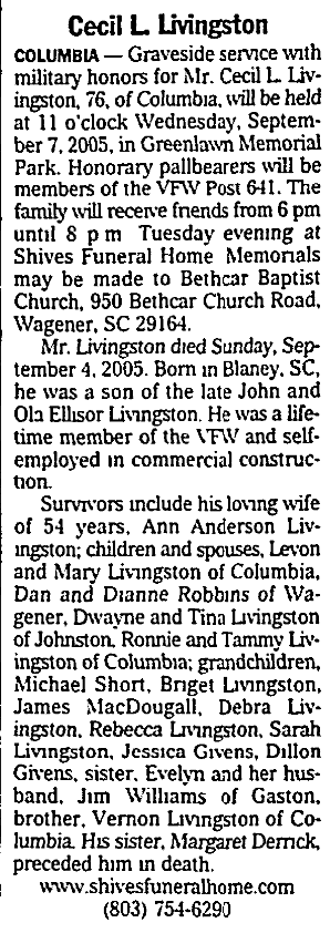 COLUMBIA – Graveside service with military honors for Mr. Cecil L. Livingston, 76, of Columbia, will be held at 11 o’clock Wednesday, September 7, 2005, in Greenlawn Memorial Park. Honorary pallbearers will be members of the VFW Post 641. The family will receive friends from 6 pm until 8 p.m. Tuesday evening at Shives Funeral Home. Memorials may be made to Bethcar Baptist Church, 950 Bethcar Church Road, Wagener, SC 29164.